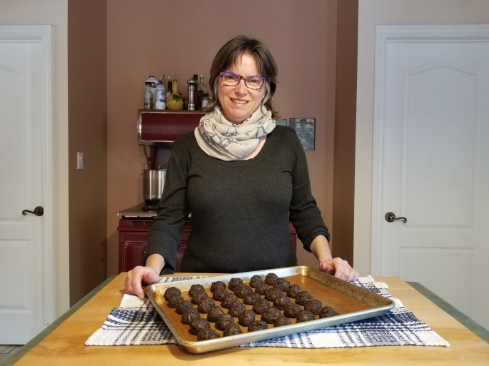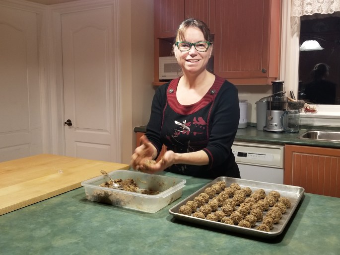 Voici les boulettes qui accompagneront nos tourtières végétariennes. Elles sont faciles à faire et délicieuses. Je les ai congelées pour la journée de Noël. J’aime beaucoup les recettes de Jean-Philippe. Il rend la cuisine simple. Il est en même temps tellement drôle…