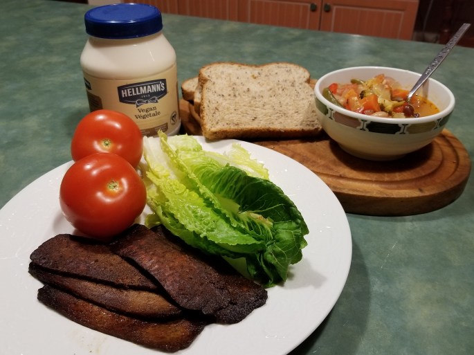 Ce soir, nous avons mangé un sandwich BLT végan, de Jean-Philippe et une soupe aux légumes que Louis a trouvé sur Pinterest.