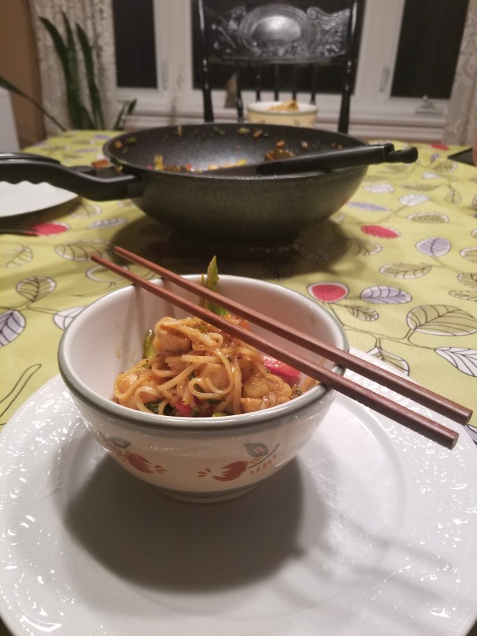 Ce soir, j’ai fait le sauté asiatique de Jean-Philippe. J’ai ajouté de la fenouille ainsi que des tiges de fleur d’ail que j’avais congelées l’été dernier. Tous les légumés peuvent y passer. Pour les nouilles, j’ai utilisé des nids de pâtes alimentaires à la semoule de blé dur. C’était vraiment bon….