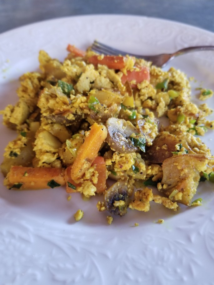La semaine de défi végane de Jean-Philippe est terminé… Je m’en fou! Ce matin, je me suis fait un tofu brouillé pour le petit déjeuner. Vraiment bon! Pour ma part, j’ai mis la moitié de tofu demandé et j’y ai ajouté les légumes que j’avais…C’est une recette que je vais continuer de faire lorsque j’aurai envie de manger des oeufs brouillés…