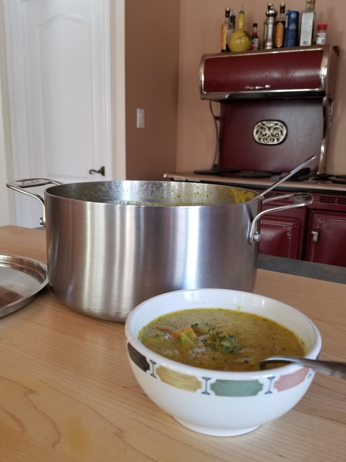 Aujourd’hui, j’ai fait une soupe aux brocolis, carottes et fromage. Au lieu de mettre du bouillon de poulet, j’ai mis du bouillon de légumes. Je n’avais pas de crème, j’ai mis à la place une boisson aux amandes enrichie. J’ai également utilisé un cheddar fort. Excellent potage!