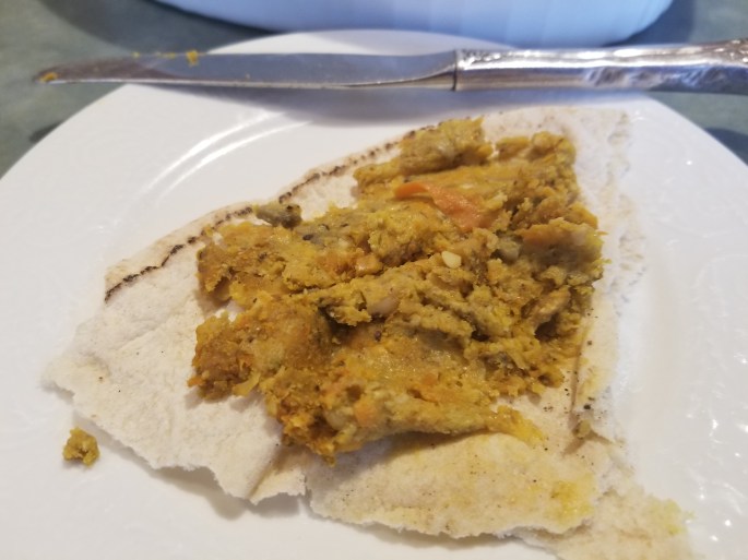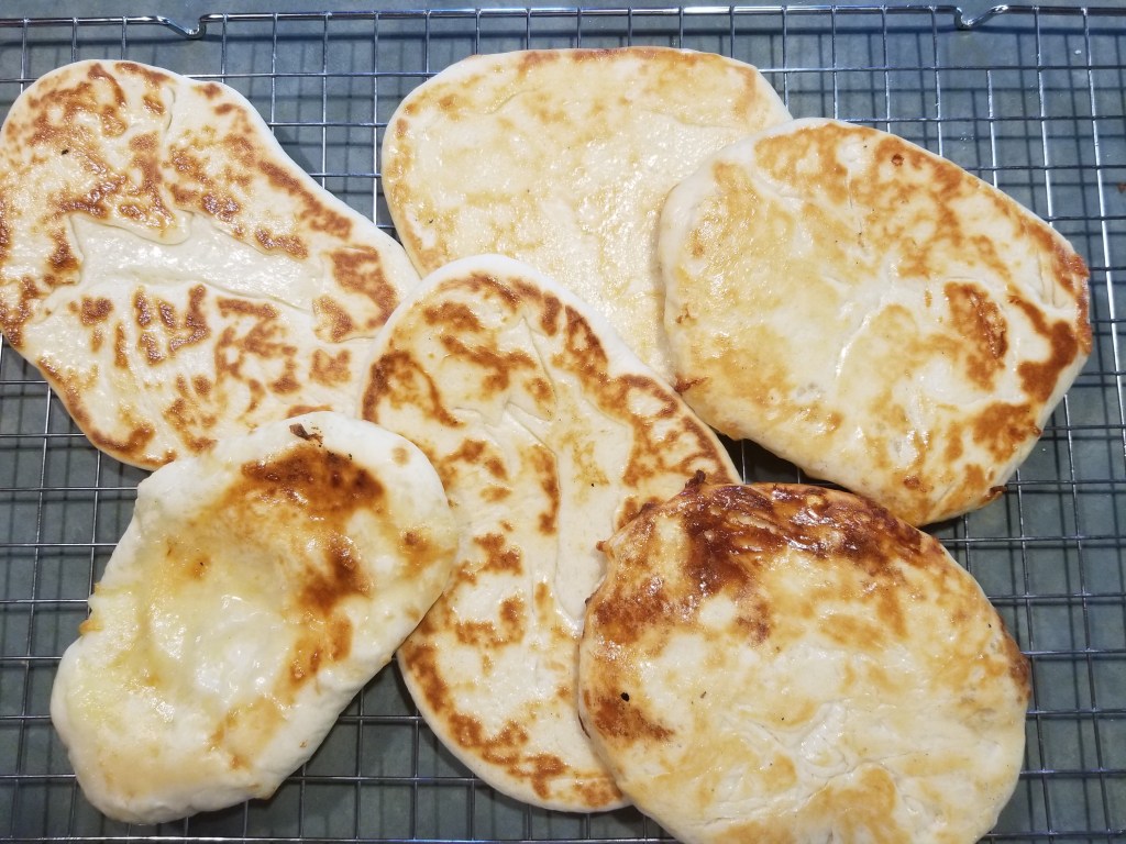 Mes premiers pains naan… Je les ai fait cuire au four 3 à 4 minutes de chaque côté. La prochaine fois, je vais les faire cuire dans une poêle en fonte et je vais faire en sorte que le pain soit moins épais….