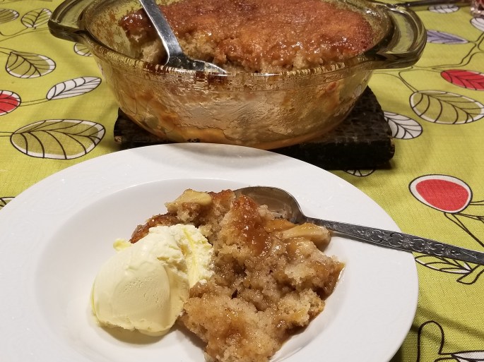 Il me restait de veilles pommes. J’en ai profité pour faire ce pouding de Ricardo. J’y ai fait quelques petites modifications…. Pour le sirop, au lieu de la tasse d’eau, j’ai mis une tasse de jus de pomme. Au lieu de 3 pommes, j’ai mis 4 pommes coupées en tranches. J’ai aussi ajouté une cuillère à thé de cannelle à la farine. Ce pouding est réellement excellent.