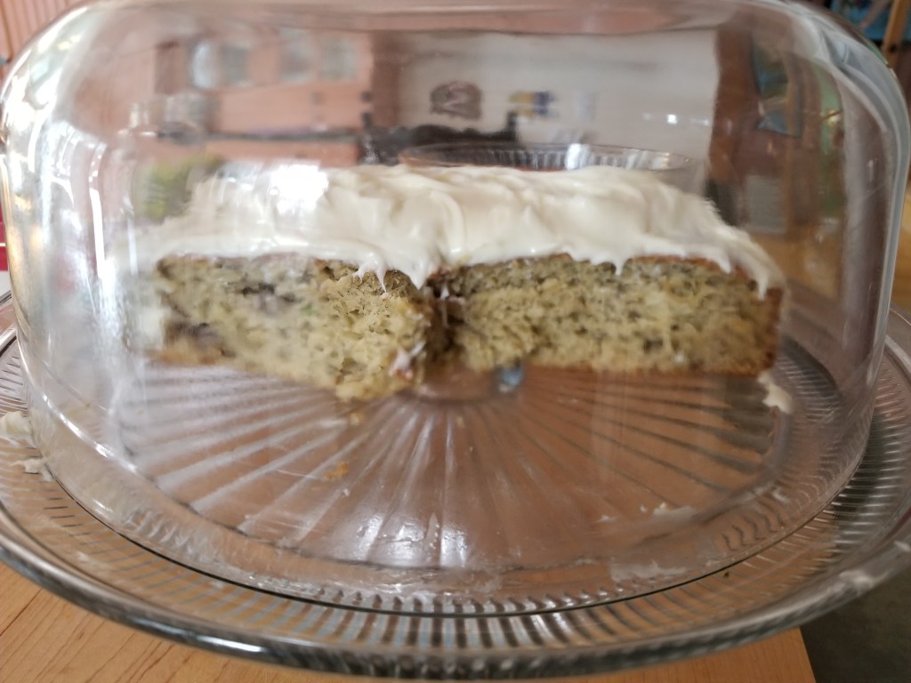 J’avais des avocats qui devenaient trop avancés. J’ai trouvé cette recette qui est vraiment très bonne. On peut y ajouter des pépites de chocolat ou des raisins secs… Je l’ai garni d’un glaçage du commerce.