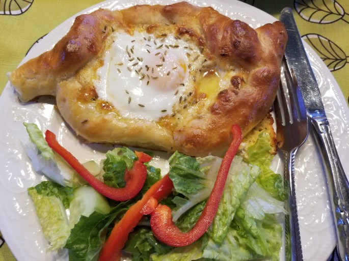 Mon fils ainé est allé il y a deux ans en Ukraine où il y a une communauté géorgienne. C’est là, qu’il a mangé pour la première fois ce pain géorgien. Mine de rien, il m’a envoyé la recette et pour lui faire plaisir, j’ai fait des khachapuris pour souper. Vraiment bon… Pour la cuisson des oeufs, il ne faut pas dépasser 3 minutes.