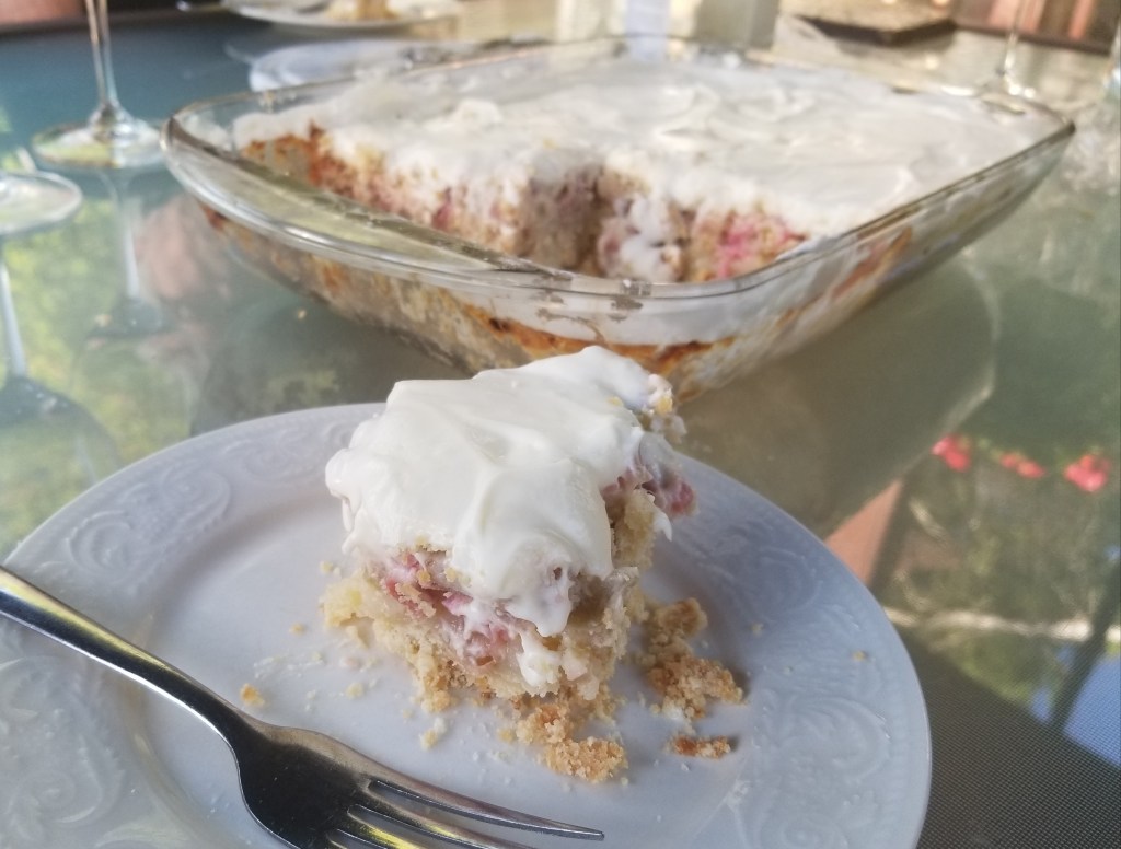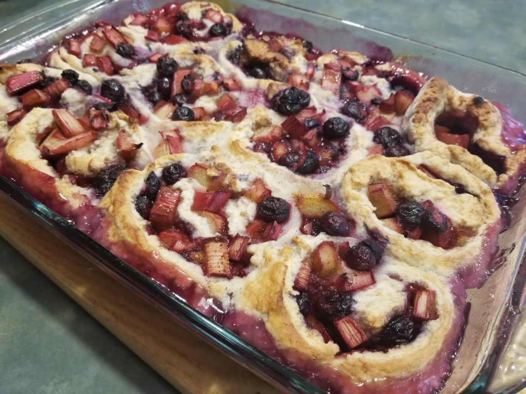 Un magnifique dessert à la rhubarbe. N’ayant plus de fraises, j’ai utilisé des bleuets congelés. C’est un dessert que ma mère nous avait fait lorsque nous étions jeunes…. Il faut faire cuire 25 minutes au lieu de 30…