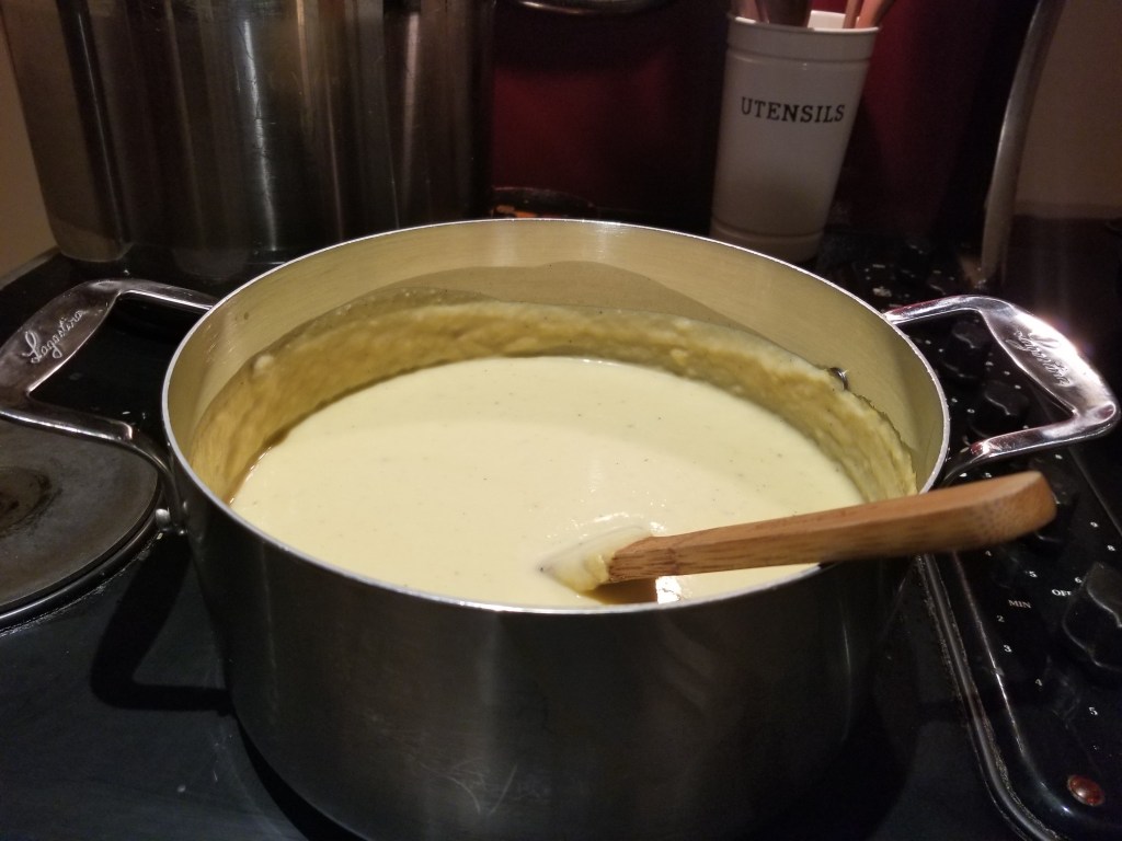 En cette veille du jour de l’an 2019, nous popotons! Je fais la bûche au chocolat de Ricardo ainsi qu’un « fauxmage » aux fines herbes de Jean-Philippe… Louis, mon mari est en charge de préparer la lasagne aux fruits de mer. Comme il pense à tous, il en fera une végétarienne.