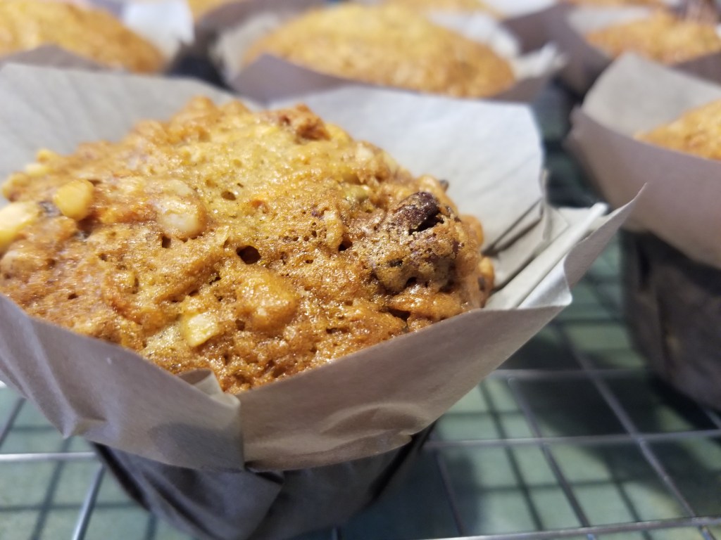 Ce sont des muffins gourmands qui se mangent à toute heure de la journée…. Au lieu d’une tasse d’huile, j’en mets seulement 2/3 de tasse et je les fais cuire 30 minutes.