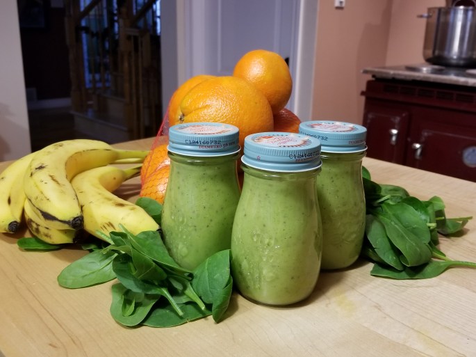 -350 ml de jus d'orange -deux mangues -une banane -une poignée d'épinard -Deux grosses cuillères à table de yogourt à la vanille -une cuillère à table de sirop d'érable -une cuillère à soupe de graines de chia