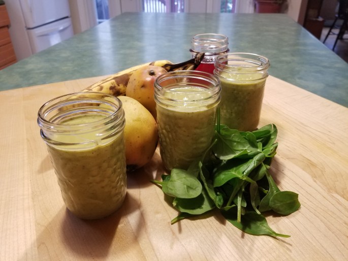 -1/2 tasse de jus de canneberges -2 mangues -une banane -1/4 de tasse de yogourt -une poignée d'épinards -une cuillère à soupe de graines de chia